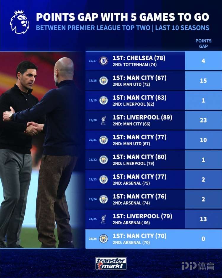 德国转会市场盘点了英超近10个赛季还剩最后5轮比赛时的前两名球队分差,本赛季0分最少。